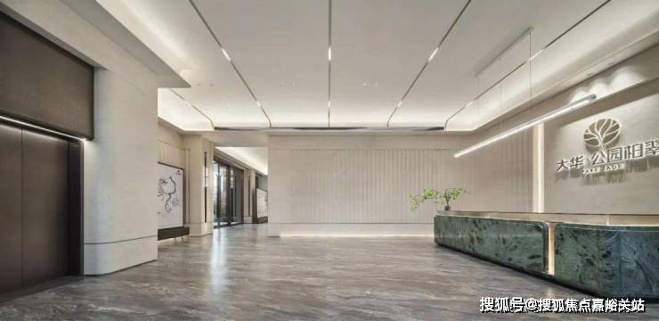 整座大堂外墙采用伯爵灰大理石满铺高墙,电动门镶嵌宝格绿奢石,实现无感通行;