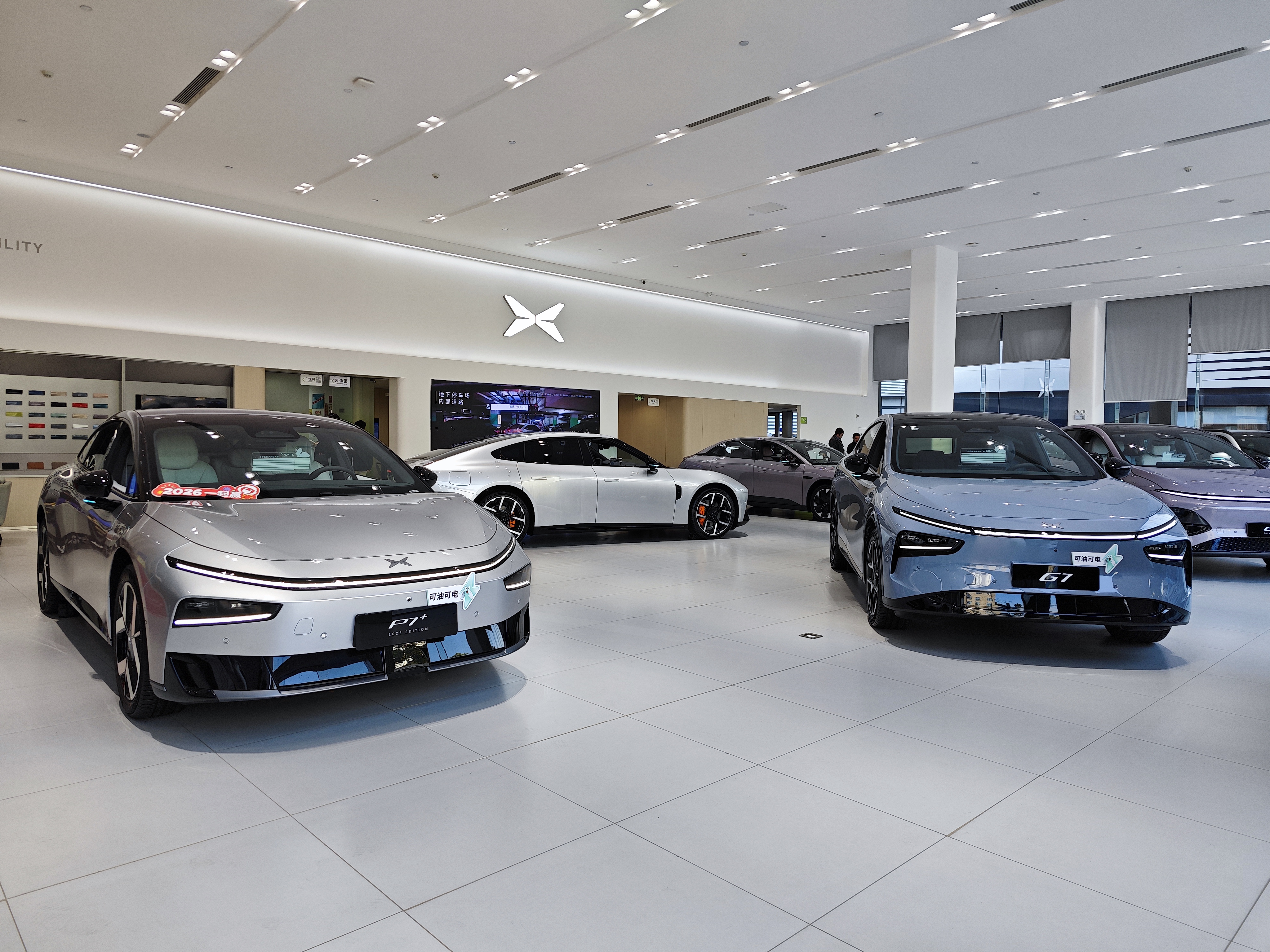 电车通跑了三家小鹏的线下门店,发现门店都会将2026款小鹏P7+和小鹏G7放在最显眼的位置,不过有意思的是,尽管展车上都贴着醒目的「可油可电」的宣传语,但店里陈列的其实都是纯电版车型,增程版只能在试驾的时候体验到。