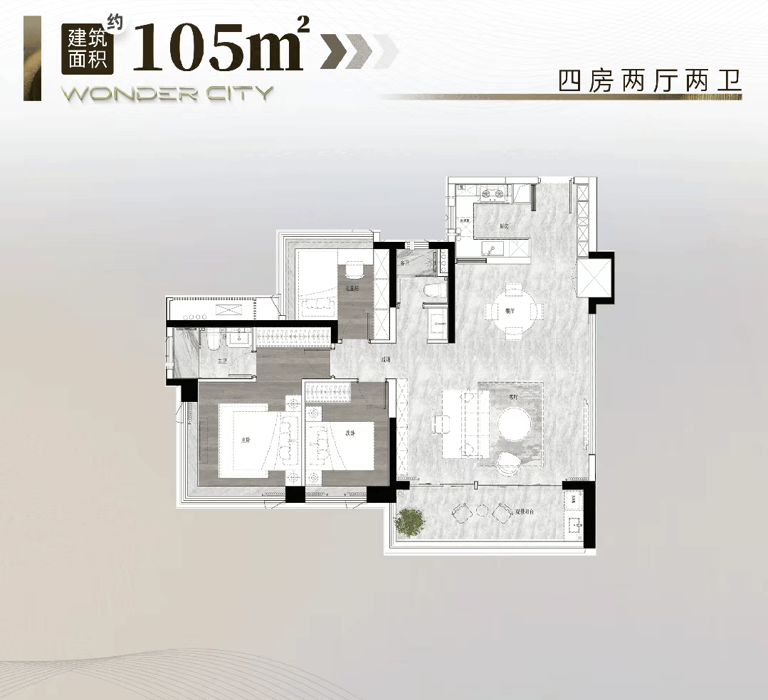 即将推出的二期为超新规产品,使用率高达120%,位置更靠近万博CBD,主推建面约105平及128平四房。建面约105㎡四房两厅两卫户型,采用四开间朝南、LDKB一体化设计,5.9m开间巨幕客厅搭配主卧270°全景飘窗,尽享千万级大平层同款CBD墅景;餐厅宽度升级到约4.3米,客厅开间最大可做到约6.1米,餐客厅面积超30平,媲美市面上约150平+户型的客厅尺寸,空间感十足。