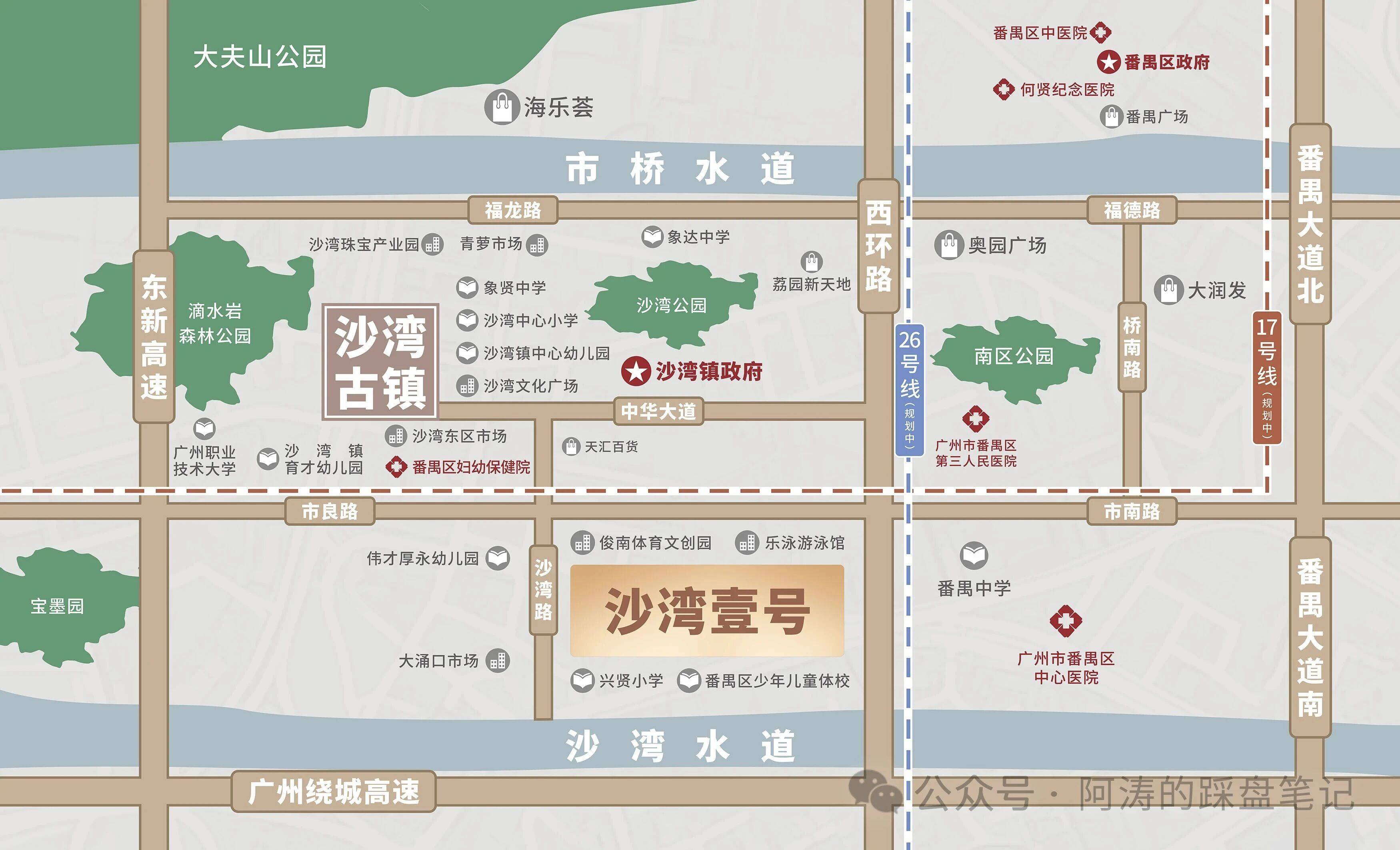 虽然目前沙湾片区主要依赖公交与自驾,但未来的轨道交通前景广阔。根据规划,地铁17号线号线将在附近设站(具体站点以政府最终公布为准)。这两条线路一旦建成,将把沙湾片区直接纳入广州地铁网络,实现与珠江新城、金融城等核心商务区的无缝对接。届时,通勤时间将大幅缩短,居住价值将进一步提升。