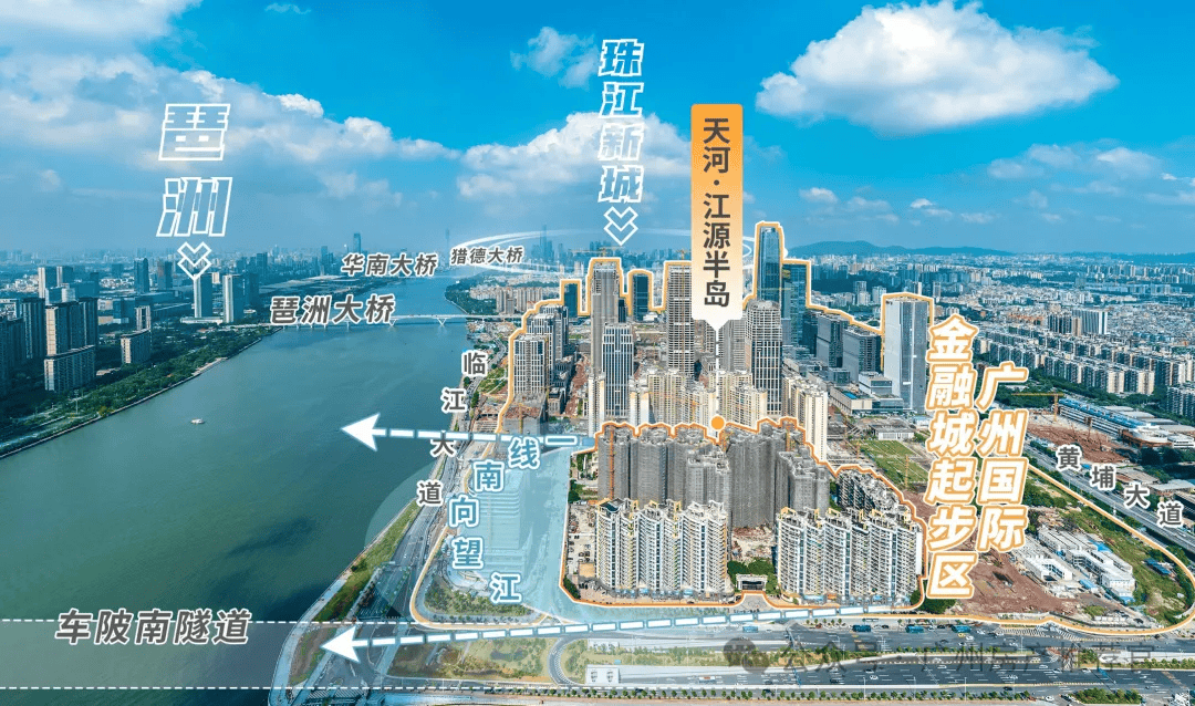 天河·江源半岛坐落于广州国际金融城起步区,处于珠江新城、广州国际金融城和琶洲形成的“黄金三角区”核心位置,这一区域是中国最大的CBD集群,汇聚了海量的金融、科技、商务资源,地段价值无可替代。 交通方面,项目周边构建了“航空、城际、地铁、磁悬浮”四维立体交通网络,出行便捷高效。紧邻金融城站,站内设有值机大厅,可直接办理登机手续,到达机场后即可快速登机;广佛环线城际(建设中)开通后,10分钟可到达广州南站,20分钟直达白云机场;规划中的广深磁悬浮列车,15分钟可到达深圳福田,贯穿穗佛莞深等湾区核心城市,实现粤港澳大湾区一小时生活圈;地铁4/5号线分钟可达珠江新城,轻松畅达广州各核心区域。