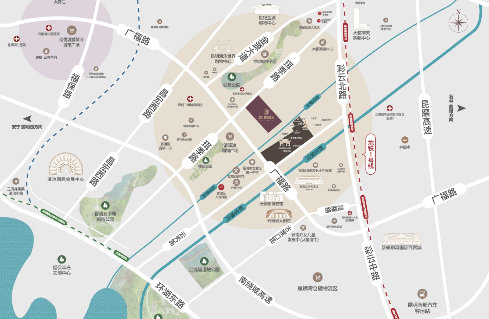 集群效应,文化高地:区域将省博物馆等多个省级文化场馆围绕官渡古镇集中布局,旨在创建一个功能齐全、影响力巨大的省级文化中心区。市民与游客在此能够享受“一站式”文化体验:从彰显古代历史底蕴的云南省博物馆,到展现现当代艺术风采的云南文苑,再到承办高雅艺术演出的云南大剧院,这些地标共同构筑起城市全新的人文封面。